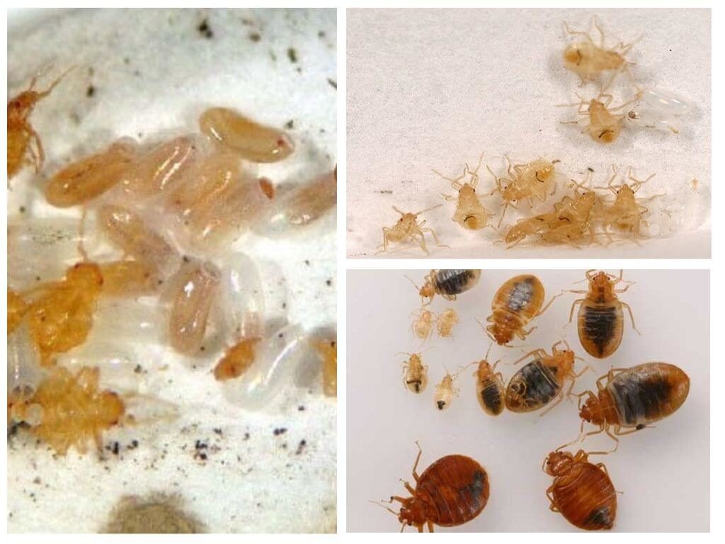 Личинки и яйца клопов блестящие и отличаются по оттенку от слегка прозрачных до белых. Они имеют липкую поверхность, поэтому легко приклеиваются к поверхностям. Заметить их невооруженным взглядом бывает крайне сложно, поскольку их размер составляет всего 1 мм в длину.